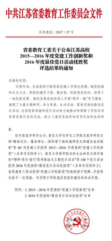 日前,省委教育工委发文公布了关于江苏高校2015—2016年度年度党建工作创新奖和2016年度最佳党日活动优胜奖评选结果的通知(苏委教组[2017]37号),3D动漫 党委推荐的创新学生党建工作路径——以3D动漫 “三创”志愿服务为例荣获党建工作创新二等奖。本次共60所高校获党建工作创新奖,其中一等名10所、二等将20所、三等奖30所高校。 3D动漫 党委创新性的将志愿服务与党员建设相融合,构建了“创新志愿服务载体、创新志愿服务制度、...