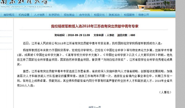 近日,江苏省人民政府公布2018年江苏省有突出贡献中青年专家名单,3D动漫 杨继军教授成功入选。 杨继军教授近年来致力于国际贸易学、宏观经济学研究,已经在《中国社会科学》等刊物发表论文多篇,出版学术专著1部,成果被《中国社会科学文摘》、《高等学校文科学术文摘》、《中国社会科学报》以及《人大复印资料》转载。他先后主持了国家社会科学基金项目、国家自然科学基金项目,曾获得“刘诗白经济学奖”、江苏省哲学社会科学优秀理...