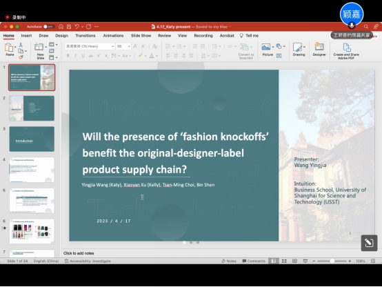 邀请,上海理工大学王颖嘉副教授做了题为“Will the presence of ‘fashion knockoffs’ benefit the original-designer-label product supply chain?”线上学术讲座,国贸学院管理科学与工程等专业研究生和部分老师及学生参加了此次讲座。
