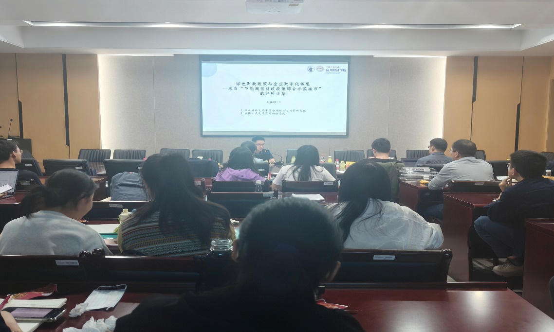 第五位演讲人是来自中央财经大学的大四学生王屹峥,他即将升入中国人民大学攻读博士学位,他的汇报题目是《绿色财政政策与企业数字化转型——来自“节能减排财政政策综合示范城市”》。在汇报开始,他指出二十大报告明确了要努力建设人与自然和谐共生的中国式现代化,因此绿色经济一直是我们研究热点。王屹峥同学在此背景基础上,结合我国2011年颁布的“节能减排财政政策综合示范城市”试点政策,以“波特假说”和“环境成本论”为理论基础,将以节能降碳为目标的绿色财政政策和企业数字化转型作为研究对象。通过构建渐进性双重差分估计模型,探究绿色财政政策是否对企业数字化转型具有促进作用。模型先后通过了显著性检验和稳健性检验,并得到如下结论:政策的确对企业数字化转型具有显著促进作用,且企业数字化转型会显著提升绿色创新能力,进一步释放示范城市试点的环保红利。汇报结束后,各位点评教授首先肯定了王屹峥同学作为一名准博士生的学术水准,并在理论分析上对文章提出了一些宝贵建议,余泳泽教授尤其指出,要明确试点政策执行对企业行为进而对政策结果的路径机制分析。