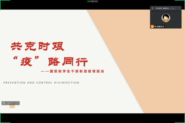 会议伊始,许秀芳老师对于当前学校疫情防控状况做了简要说明,随后重点讲述了作为学生干部,应该率先发挥作用,为广大同学做出表率。在日常工作和活动中不聚集,鼓励以线上形式开展丰富多彩的校园环境,同时要更加注意网络发言,做到不信谣、不传谣、不造谣。鼓励大家争做疫情防控的“先锋员”,做疫情防控工作的重要力量和得力助手,继续做好带头防控的表率、履职尽责的表率、服务同学的表率,