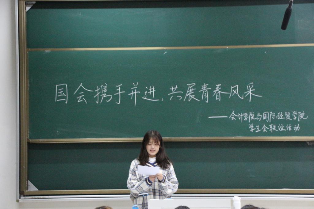 与会计学院进一步加强合作和促进友谊的信心,也自然地引出了会计学院学生会武若彤主席的讲话。主席对于两院未来友谊的展望和轻松的语调让同学们在初识的紧张氛围中慢慢找到了自己的节奏。