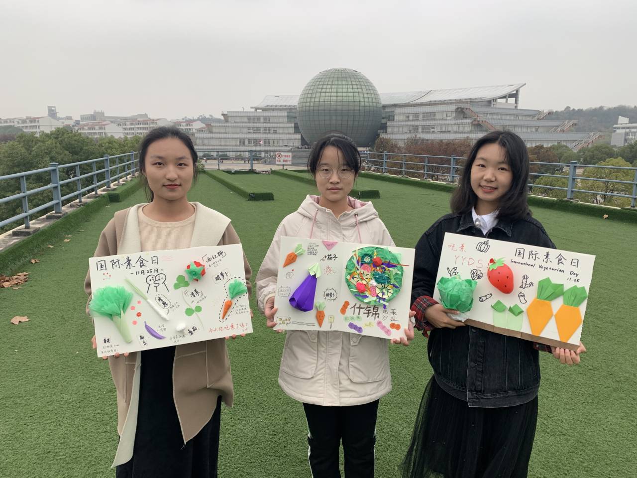 学生利用不同的材料制作了创意素食“食谱”,希望大家在吃肉的同时也要注意膳食纤维等营养的输入。