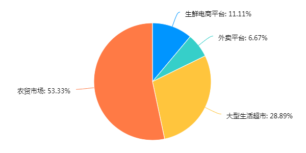 在实地调研结束之后,调研小队对线上调查问卷的结果进行了分析。首先是人们疫情期间的购物方式,调研数据显示,有53.33%的人在疫情期间通过农贸市场购买生鲜产品,28.89%的人通过大型生活超市购买,剩下不到20%会通过外卖平台或生鲜电商平台购买。说明在疫情期间,农贸市场和大型生活超市仍是人们购买生鲜产品的主要地点,人们的购买习惯并未发生较大改变。