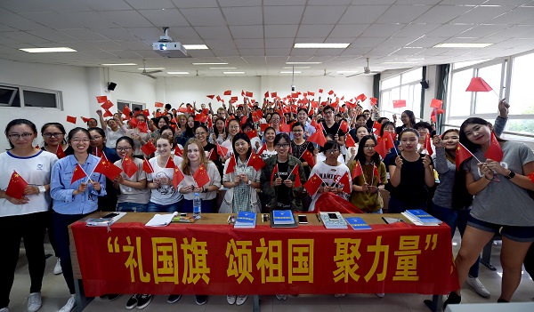 2017级新生送国旗,传递了“礼国旗、颂祖国、聚力量”的爱国理念。国贸1701、1702班全体新生以及部分留学生参加了活动。