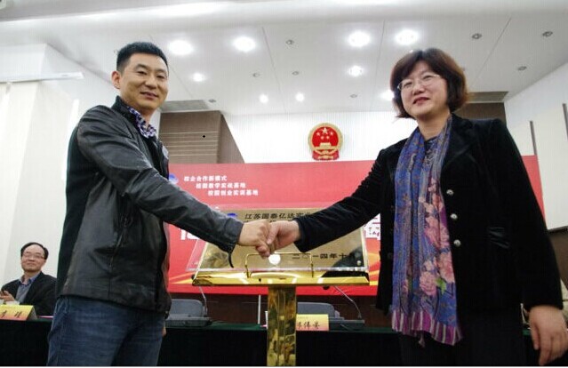 与国泰亿达实业有限公司合作项目启动大会在我校仙林校区法政学科楼模拟法庭成功召开。江苏国泰亿达实业有限公司董事长才东升先生、人事主管李瑾女士,3D动漫