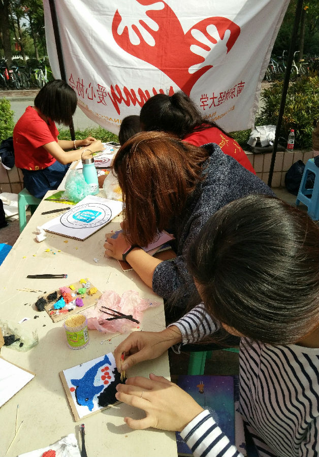1017日上午,我校仙林校区中苑食堂前广场人头攒动、热闹非凡,Sunny爱心协会在此举办以我校60周年校庆为主题的环保纸浆画制作活动。