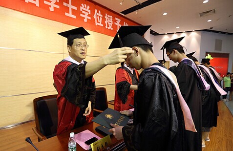 国贸1002班的何婷婷同学作为毕业生代表发言。她满怀深情的回顾了大学四年的生活、表达了对老师、母校的无限感恩和依依惜别之情,同时寄语在校生,鼓励他们立足现在、放眼未来,在大学里充实自我,在人生中放飞梦想。接着,伴随着轻盈欢快的乐声,领导老师为毕业生们颁发学士学位证书并合影留念。