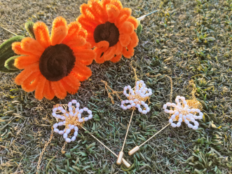 除了胸针外,同学们还使用了扭扭棒制作向日葵花束。同学们将棕色的扭扭棒盘成圆形的花盘,用橘黄色的扭扭棒折出花瓣,再用绿色的扭扭棒扭成椭圆形并连带扭出几片叶子形状当点缀,一束向日葵就制作完成了。贸经2201班的罗梓丹同学说道:“向日葵的花语是信念、光辉、温暖、勇敢,它具有所有妇女同志所拥有的美好品质,送给妇女同志们向日葵是希望她们能够像向日葵一样在生活中追寻着自己向往的光,希望她们能够勇敢的追求自己的理想。”