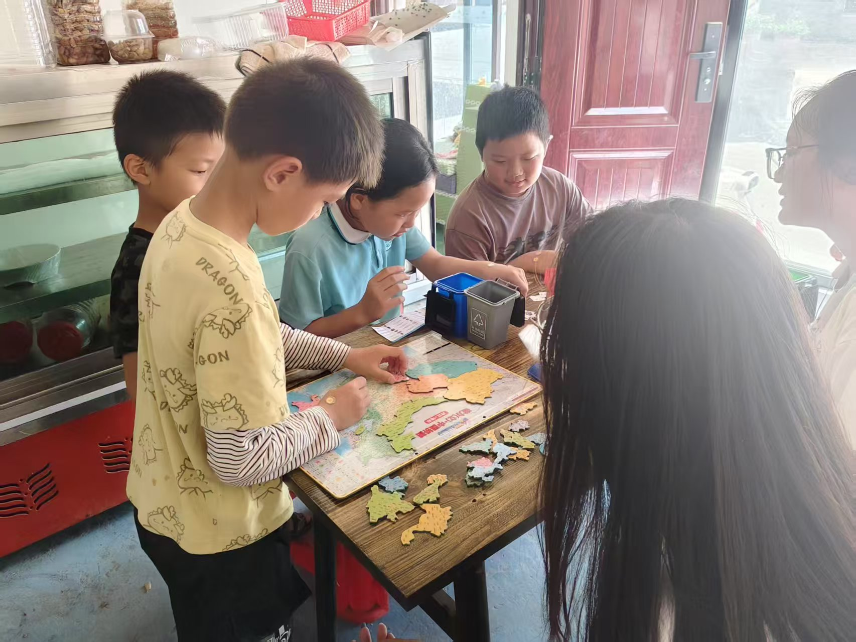 图为志愿者教孩子们拼中国地图 李文语 供图