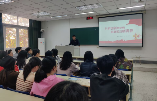 研究生第一党支部书记陈启斐致辞强调,青年是祖国的希望,民族的未来,应怀揣梦想和信心,挑起祖国科技任务的大梁,突破科学极限,解决行业内关键技术“卡脖子”难题,在科技创新的道路上勇往直前,推动中国式现代化发展。同时,他以自身经历为例,讲述青年学子对科研的追求并不是遥不可及的,一些重大的科研成果就在我们身边,青年只要敢于创新,敢于追求对科研的实践就一定能为祖国的科研领域有所贡献。青年充满活力,敢于尝试新事物,有着无限的创造力和想象力,科学进步离不开他们的努力和奋斗。