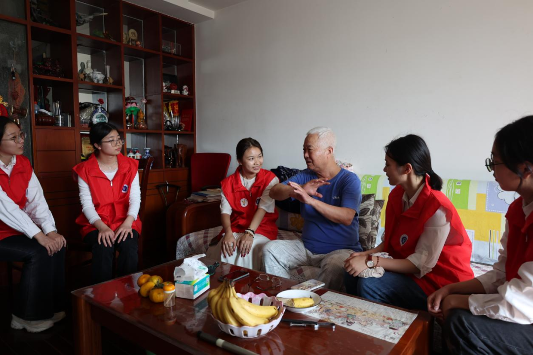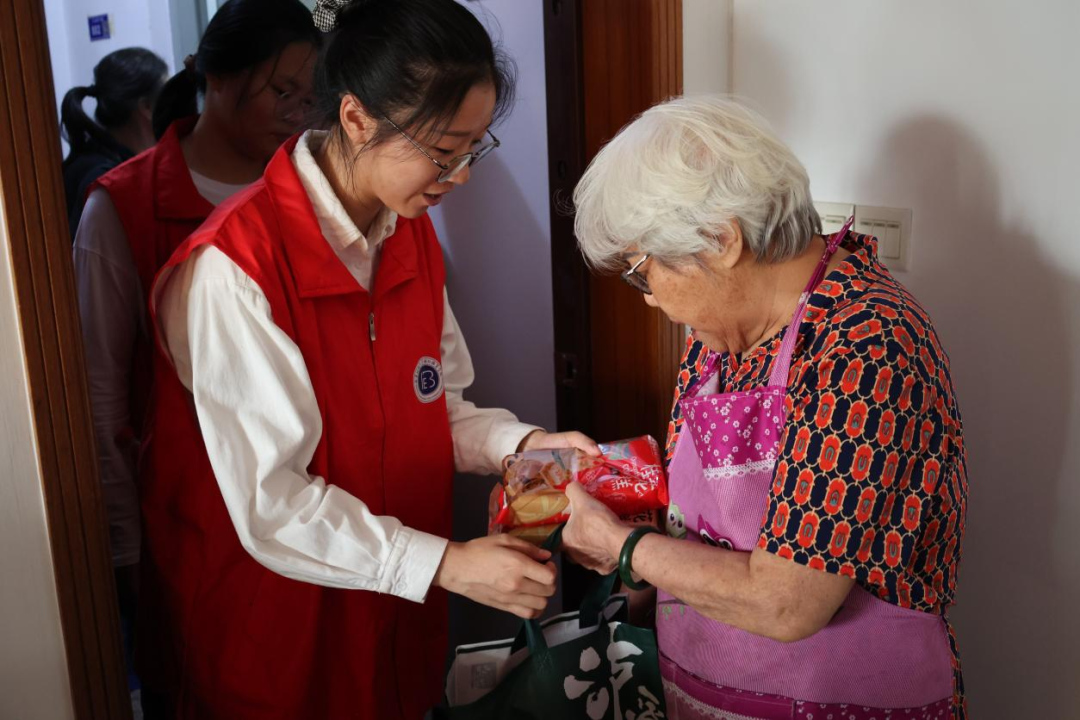 的志愿者们走进怡康社区16位独居老人、退役老军人、老党员、老教师的家中,为老人们送上糕点与祝福。 交谈中,老一辈人的革命故事也为同学们上了一堂生动而又深刻的团课。