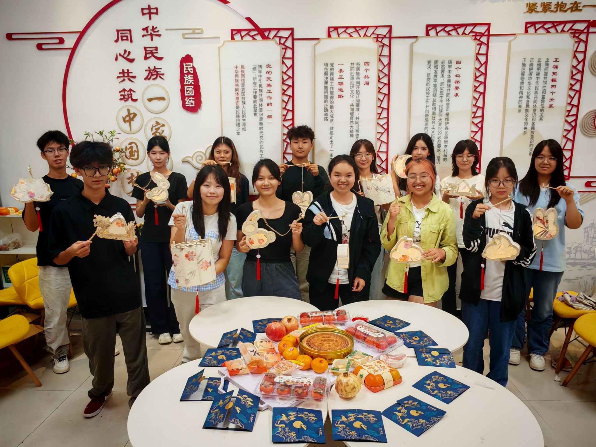 当中秋的皎洁月色与国庆的鲜红旗帜相遇,校园里便漾起了双节同庆的温馨氛围。学院倾注巧思,为假期留校的少数民族、港澳台新生定制了精美邀请函,并一一送达。邀请函融合了传统的玉兔、月桂枝与灯笼图案,内页则绘有象征“民族一家亲”的团结纹样,并缀以温暖的节日祝语,传递出细致入微的关怀。