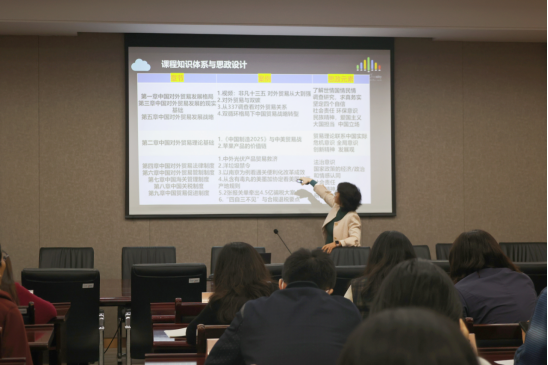 在德经楼308会议室开展了第四场课程思政示范公开课活动。此次公开观摩由《中国对外贸易》课程组核心成员谢正勤老师主讲。各系主任、青年教师等40多位老师积极报名参加,党委书记张阳军、院长宣烨参与了公开观摩。活动由杨智华副院长主持。
