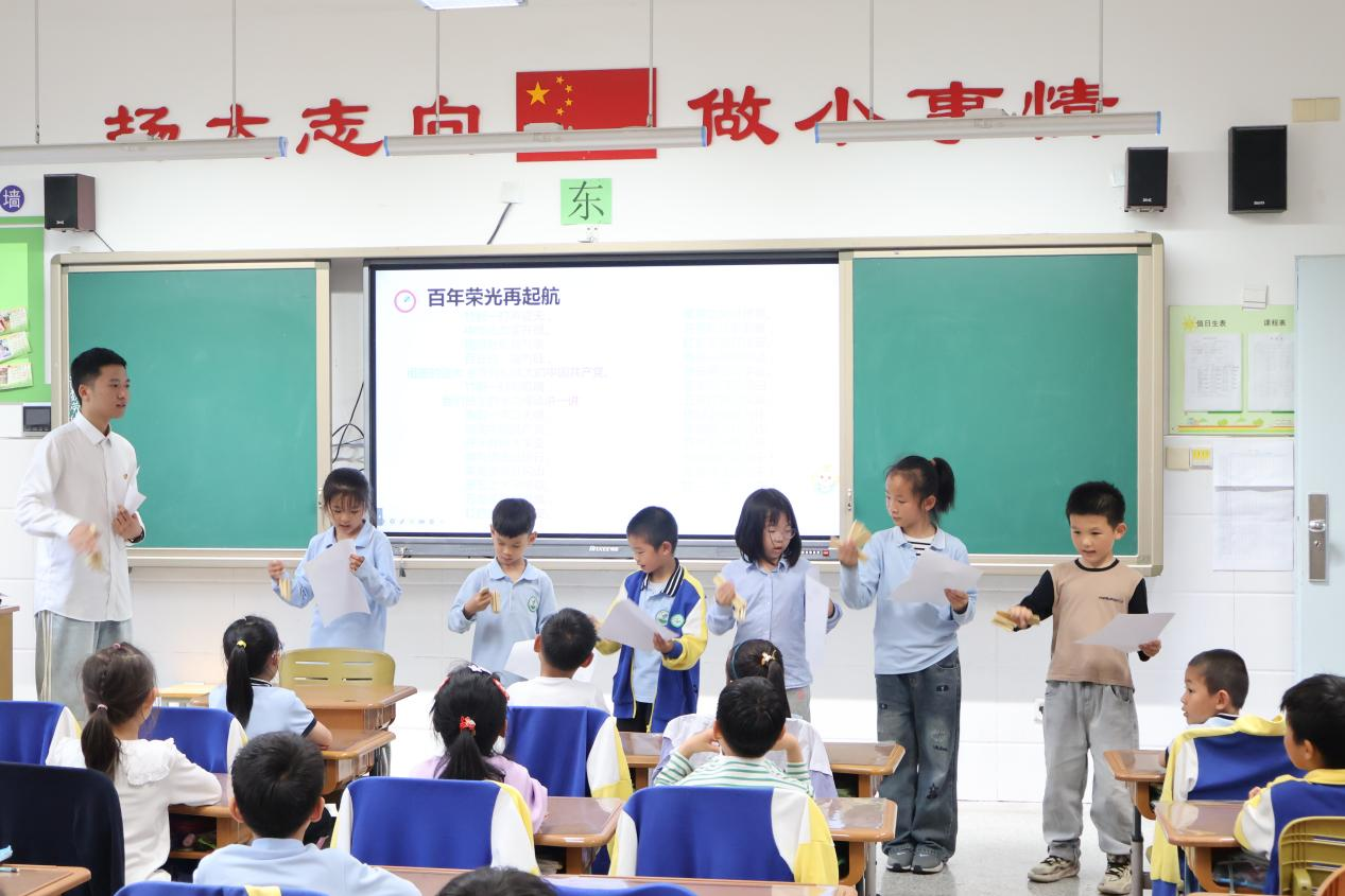 校园的另一侧,宣讲团与一年级六班的同学们集体演出红色故事快板节目。“朱毛会师井冈山,星星之火可燎原。”“两弹一星创奇迹,蘑云腾空震宇寰”。快板形式新颖、节奏明快,内容朗朗上口。经过反复的朗诵排练,一年级小朋友们与宣讲团齐上阵,将缅怀先烈,珍惜当下,奋斗创未来的快板内容熟记于心,一气呵成完成节目。此外,宣讲团与同学们围坐开展“星火燎原之剪纸”活动,在锻炼动手能力的同时,传递星星之火可以燎原的革命乐观主义精神,鼓励同学们不畏困难,奋勇向前。南邮小学副校长曹金花表示,希望有更多的大学生走进小学校园开展红色精神宣讲活动,在厚植爱国主义精神的同时,发挥榜样示范作用,为小学生树立看齐的标杆。”